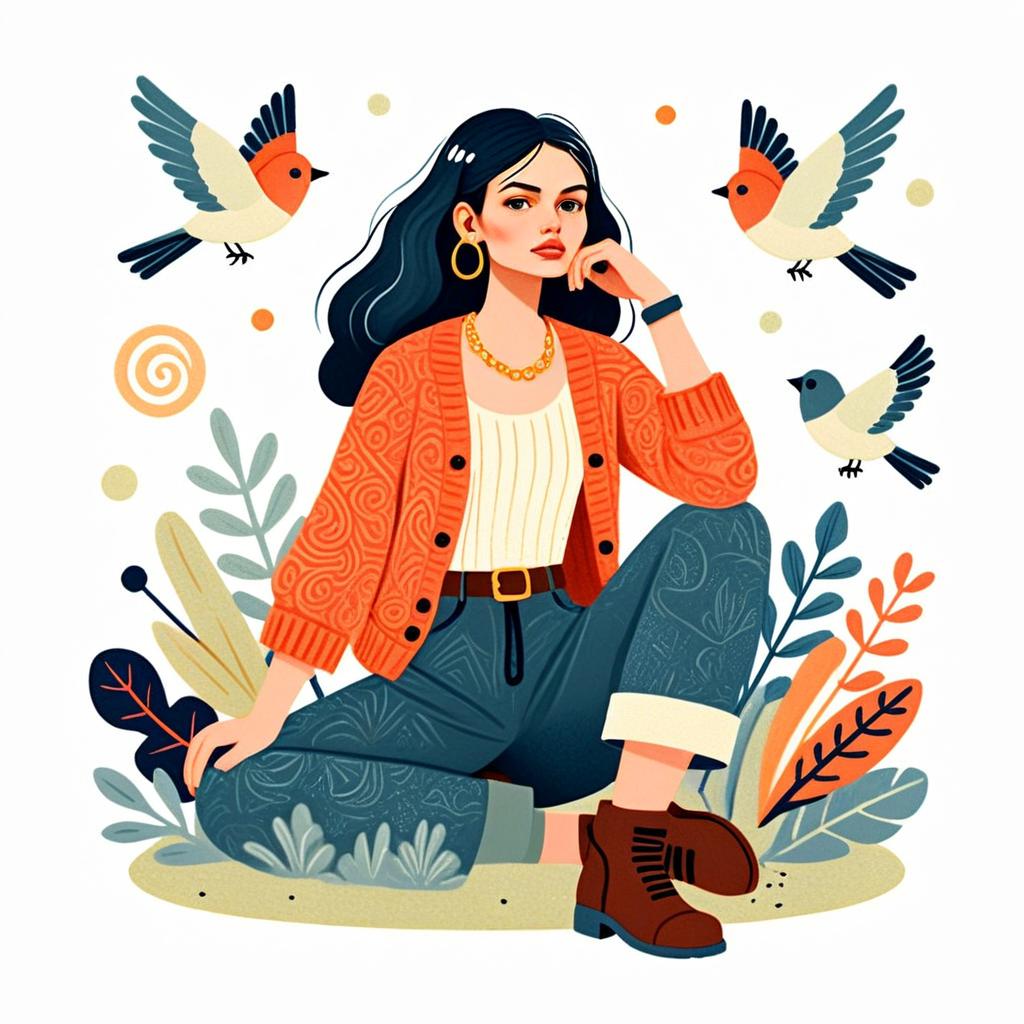 This vibrant digital illustration features a stylish young woman seated among abstract foliage with three colorful birds flying around her. She wears a textured orange cardigan, rolled-up patterned jeans, and brown boots, showcasing a modern, casual look with a confident pose. The artwork's detailed patterns and bold colors reflect a contemporary vector illustration style with a playful, nature-inspired theme.