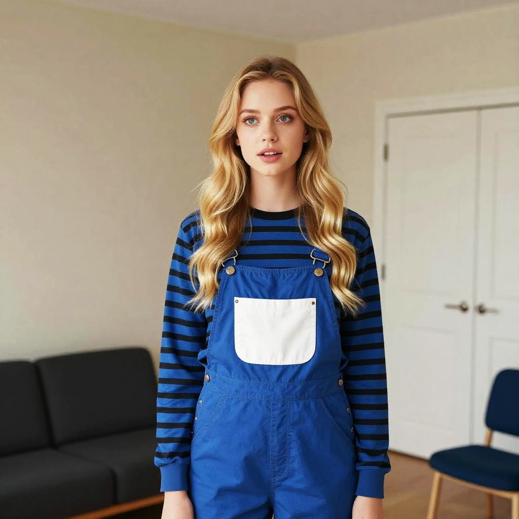 A young woman with long blonde hair wearing a blue and black striped long-sleeve shirt paired with bright blue overalls featuring a white front pocket. She stands in a modern, minimalistic living room with neutral-toned walls and simple furniture in the background, radiating a casual and relaxed vibe.