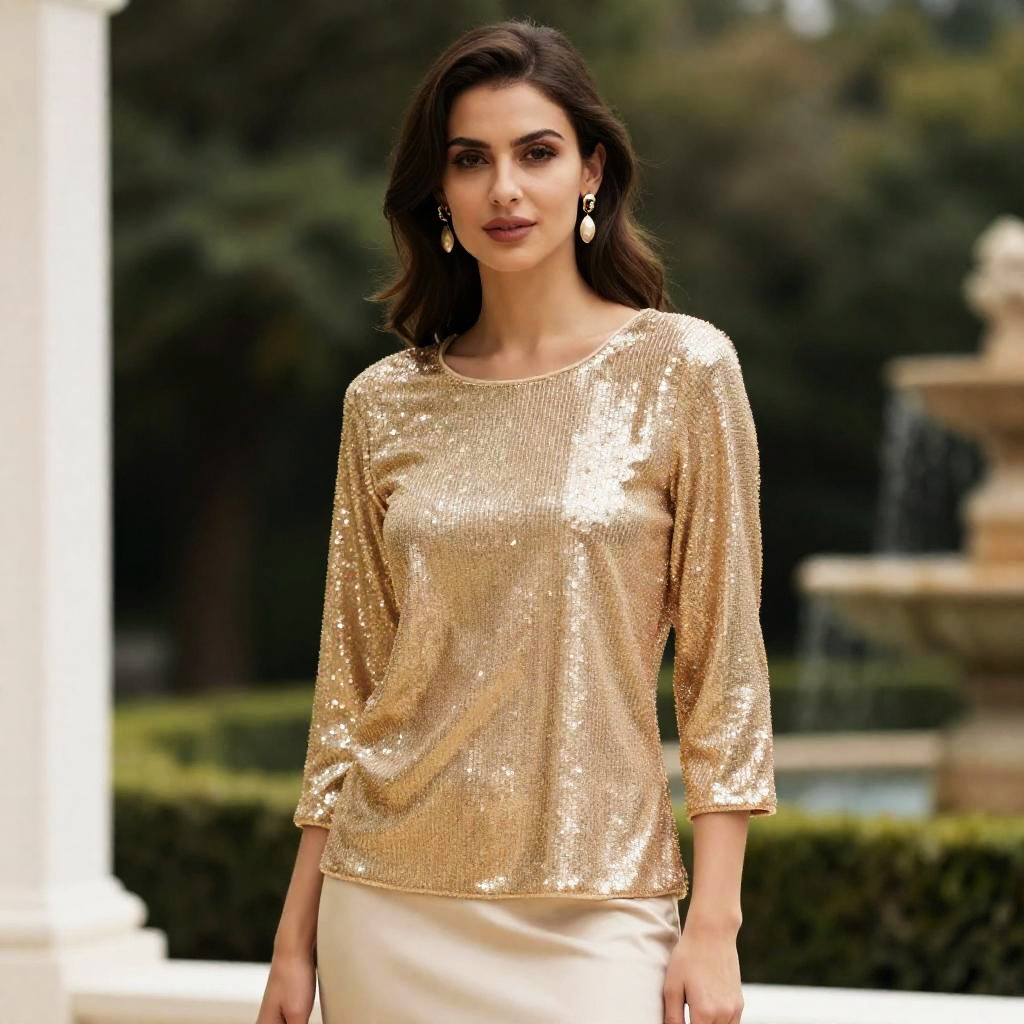 A woman elegantly stands in a garden wearing a shimmering gold sequin tunic top with three-quarter sleeves. The outfit combines a sophisticated festive style with a natural outdoor setting, highlighting refined glamour and contemporary fashion.