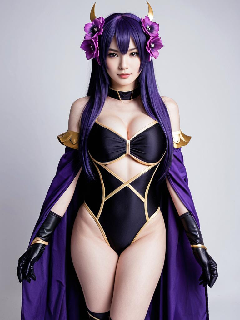 A woman dressed as Murasaki Shikibu in a swimsuit rider first ascension style cosplay, featuring a black and gold one-piece suit with a flowing purple cape. Her long purple hair is adorned with large flowers and golden horn-like accessories, perfectly embodying the character from the Fate series in a realistic and detailed cosplay photograph.