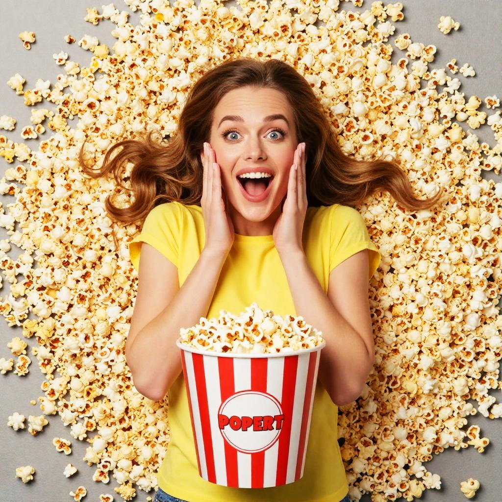 A cheerful young woman wearing a yellow shirt lies surrounded by scattered popcorn, holding a large red and white striped bucket filled with popcorn labeled 'POPERT.' Her wide-eyed, excited expression captures a fun and lively moment, perfectly fitting a Gen Z vibe.