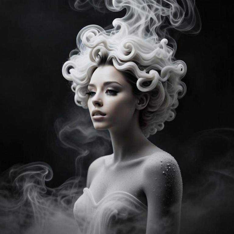 Surreal Woman with Curly White Hair Blending into Smoke