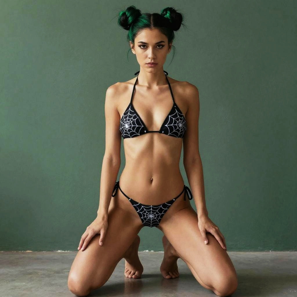 A confident woman with green hair styled in double buns poses kneeling against a solid muted green background. She wears a black bikini adorned with white spiderweb patterns, embodying a bold, edgy, and modern aesthetic often associated with Gen Z fashion trends.