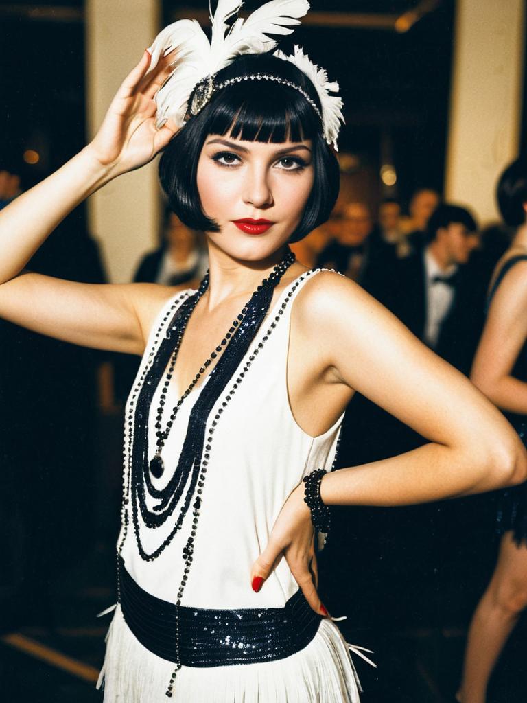 A stylish woman dressed in a classic 1920s flapper dance costume poses confidently at a cosplay festival. Her look is completed with a sleek bob haircut, bold red lipstick, dramatic eye makeup, and a feathered headband, embodying the iconic glamour of the Jazz Age.
