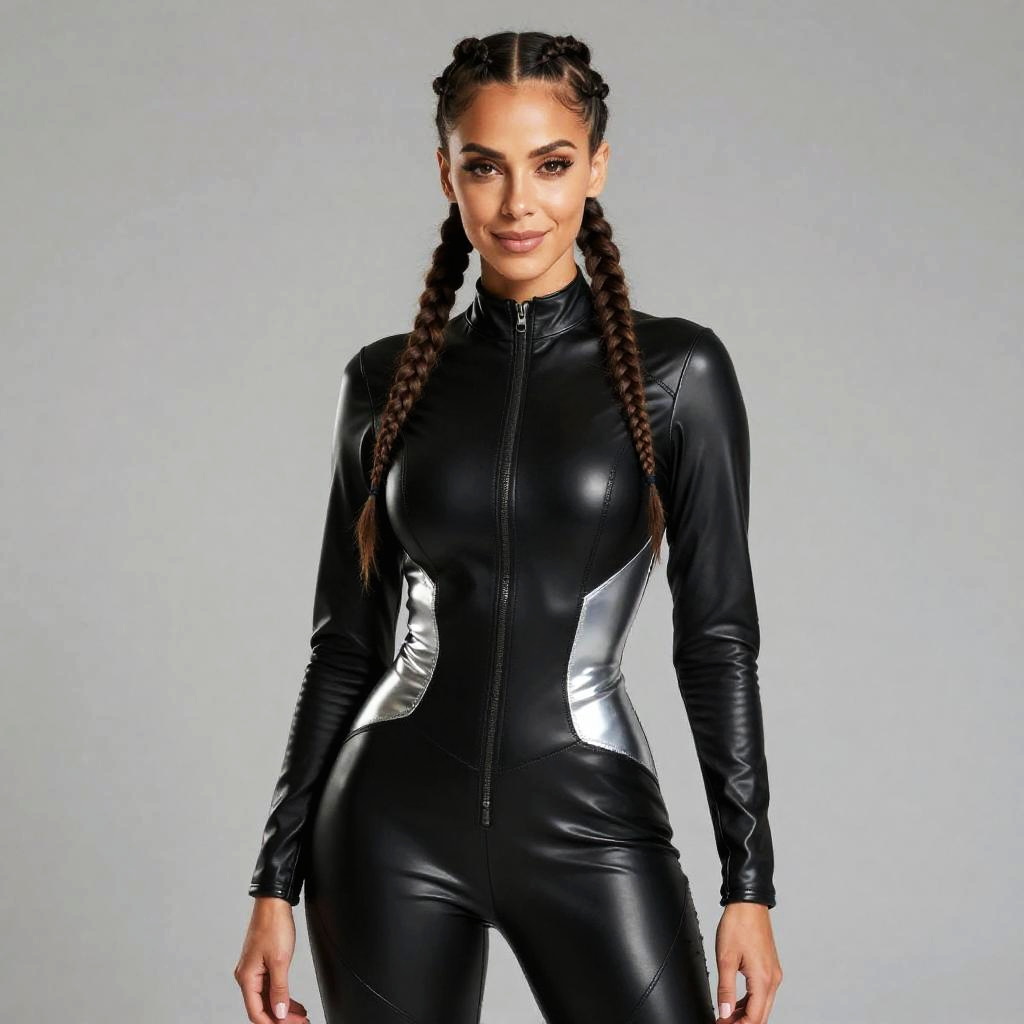 A confident woman poses wearing a sleek black and silver faux leather jumpsuit with a front zipper, showcasing a modern and edgy Gen Z fashion style. Her hair is styled in two long braids, complementing the futuristic and sporty look against a simple gray background.