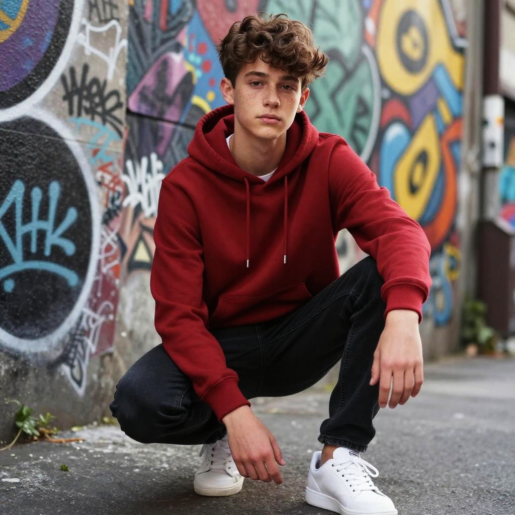 A teenage boy wearing a red hoodie and black jeans squats in front of a vibrant graffiti-covered wall. The urban street style and casual pose capture the essence of modern youth culture and Gen Z fashion trends.