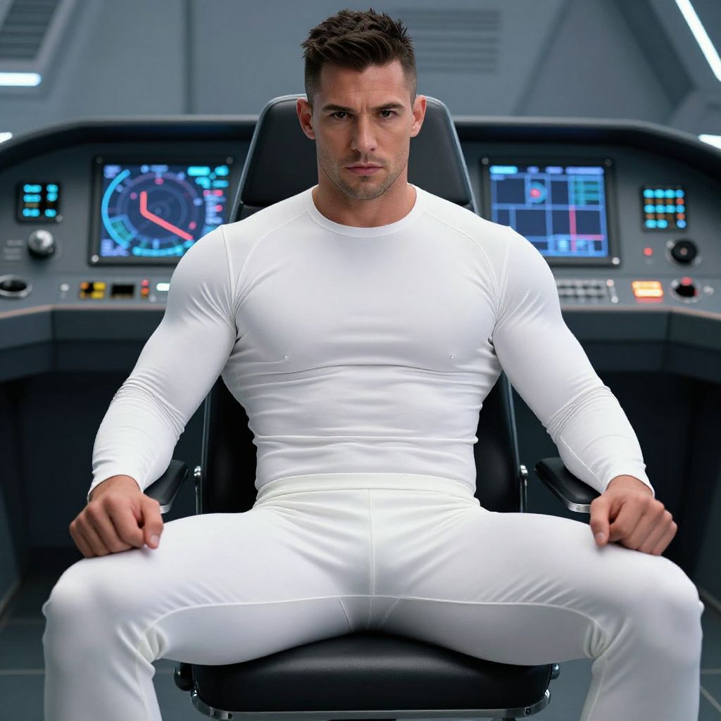 A fit man dressed in a tight white long-sleeve shirt and matching pants is seated confidently in a high-tech control chair with futuristic dashboard screens behind him. The image conveys a modern sci-fi or space exploration theme, emphasizing strength and focus.