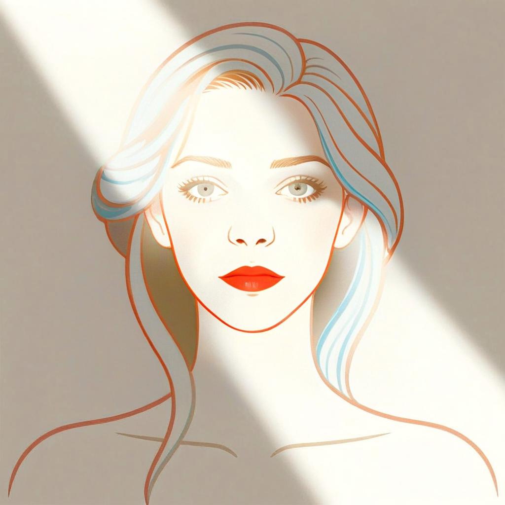 This digital illustration features a stylized woman with flowing, lightly shaded hair accented by soft blue streaks. Highlighted by a beam of light, her red lips and serene expression create a striking contrast against the minimalist, neutral background, reflecting a modern and elegant art style.