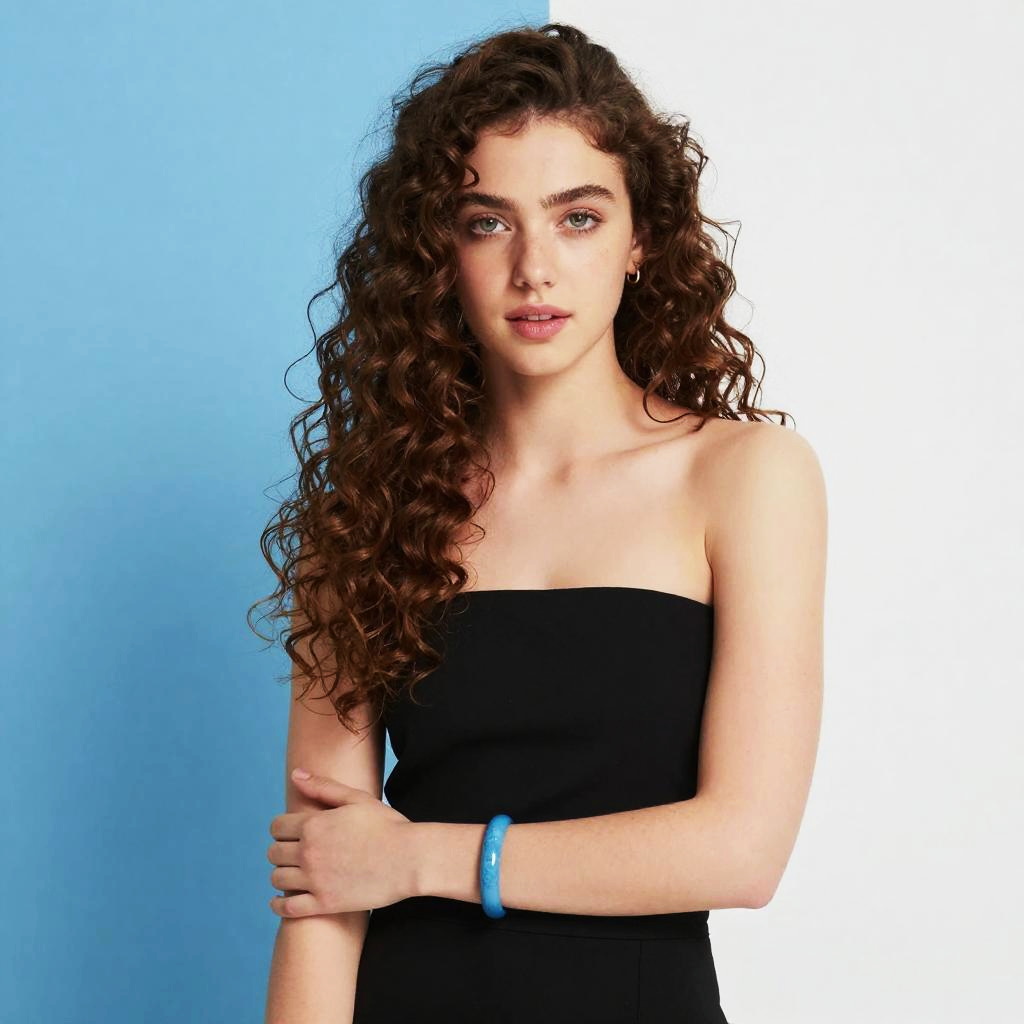 A young woman with voluminous curly hair poses against a two-tone blue and white background. She wears a strapless black top and a striking blue bracelet, creating a vibrant contrast that highlights her natural beauty and confident expression.