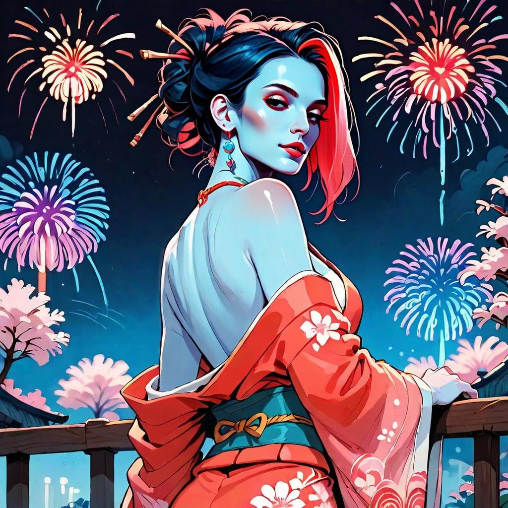 A striking digital illustration features a woman dressed in a traditional red kimono adorned with floral patterns, standing against a backdrop of colorful fireworks and blossoming cherry trees. The artwork blends vibrant neon colors with a modern anime-inspired style, highlighting the subject's confident and serene expression as she gazes over her shoulder.