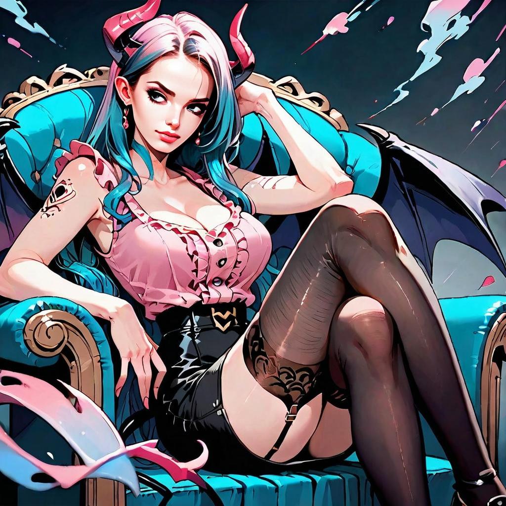 This digital artwork features a confident woman with blue and pink hair styled in a fantasy anime-inspired look, complete with devil horns and dark wings. She lounges on an ornate turquoise chair, wearing a pink frilled blouse and black high-waisted shorts with sheer thigh-high stockings, blending gothic and modern elements in a vibrant, stylized composition.