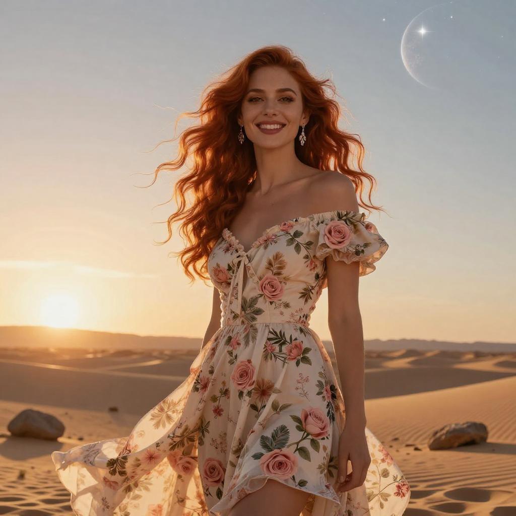 A joyful woman with flowing red hair stands in a desert landscape at sunset, wearing a delicate off-shoulder floral dress adorned with pink roses. The warm golden light enhances the serene atmosphere, while a faint crescent moon glimmers in the clear sky above, adding a touch of fantasy to this captivating scene.