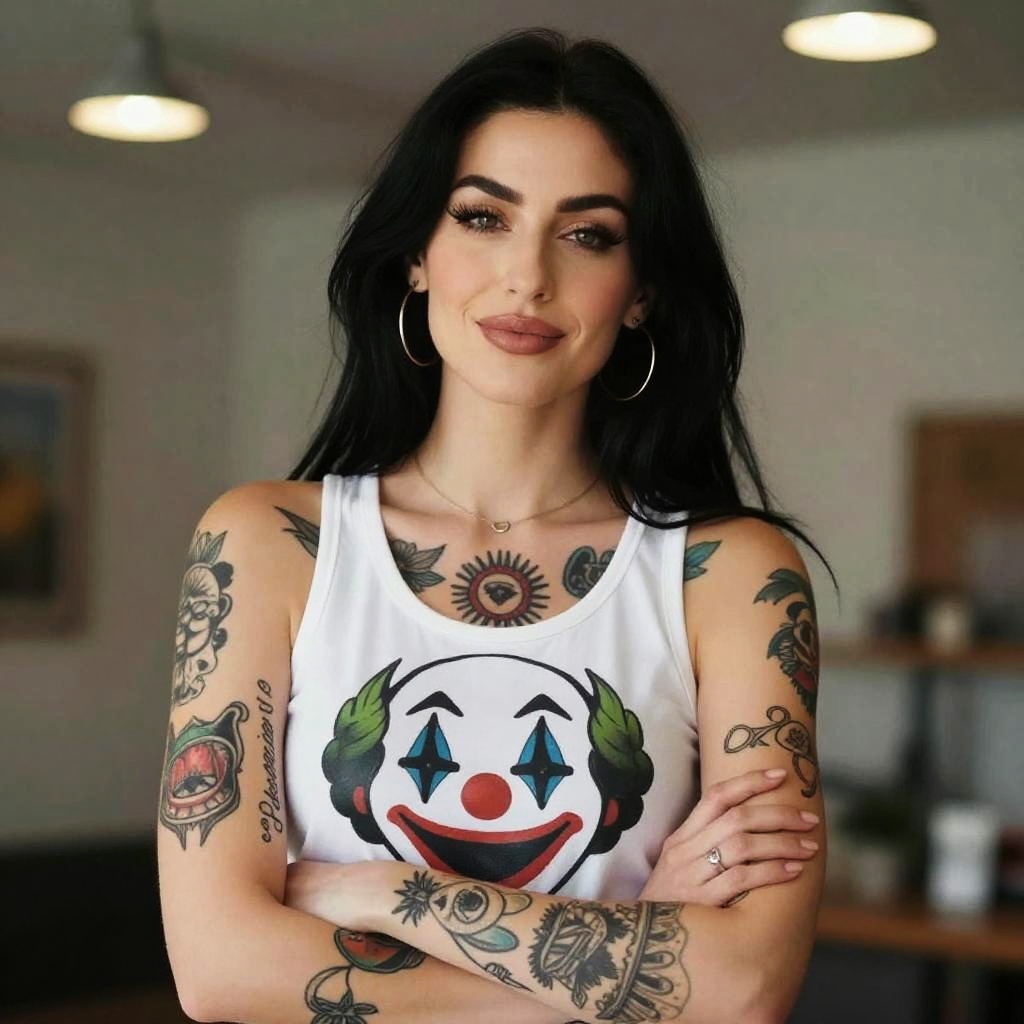 A confident woman with long black hair and multiple tattoos poses with her arms crossed, wearing a white tank top featuring a large colorful clown face design. Her makeup is stylish and she accessorizes with hoop earrings and a delicate necklace, exuding a bold and modern vibe.