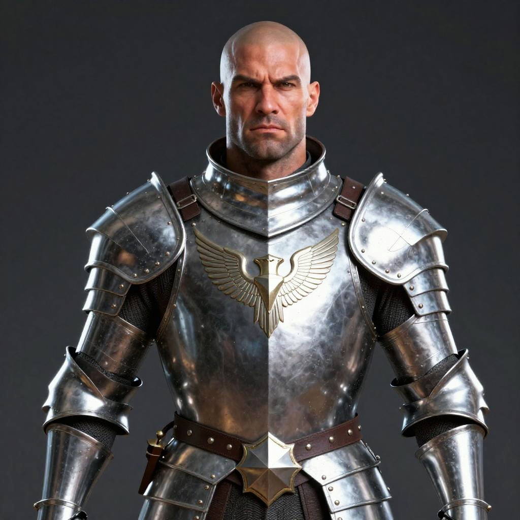 A stern man stands confidently wearing a polished medieval suit of armor featuring an embossed eagle emblem on the chest plate. The detailed armor includes shoulder guards and gauntlets, emphasizing a historical warrior aesthetic with a modern photographic realism style.
