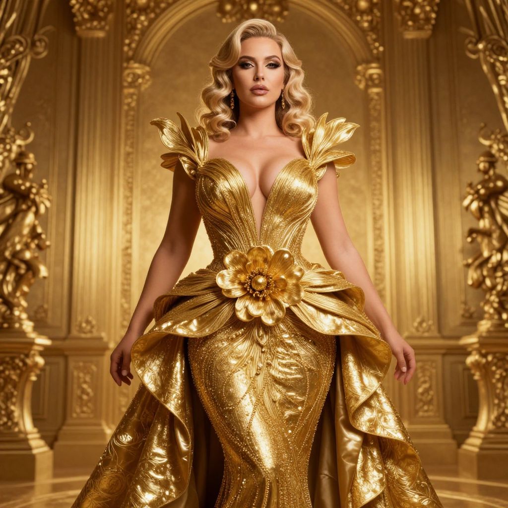 A glamorous woman stands confidently in an opulent golden gown adorned with intricate floral and leaf motifs, exuding luxury and elegance. The baroque-style background complements the regal aesthetic of the dress, enhancing the overall lavish atmosphere of the image.