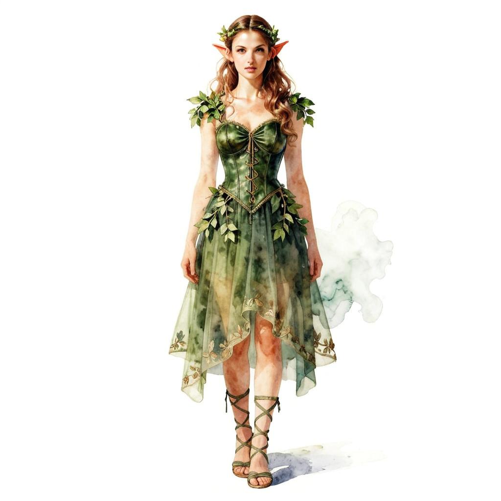 This image features a woman dressed as a forest elf, wearing a detailed green corset dress adorned with leafy accents and an asymmetrical translucent skirt. Her look is complemented by pointed elf ears, floral elements, and lace-up sandals, set against a minimal white background highlighting the fantasy and ethereal nature of the character. The style is a realistic digital illustration with soft watercolor effects, emphasizing fantasy aesthetics.