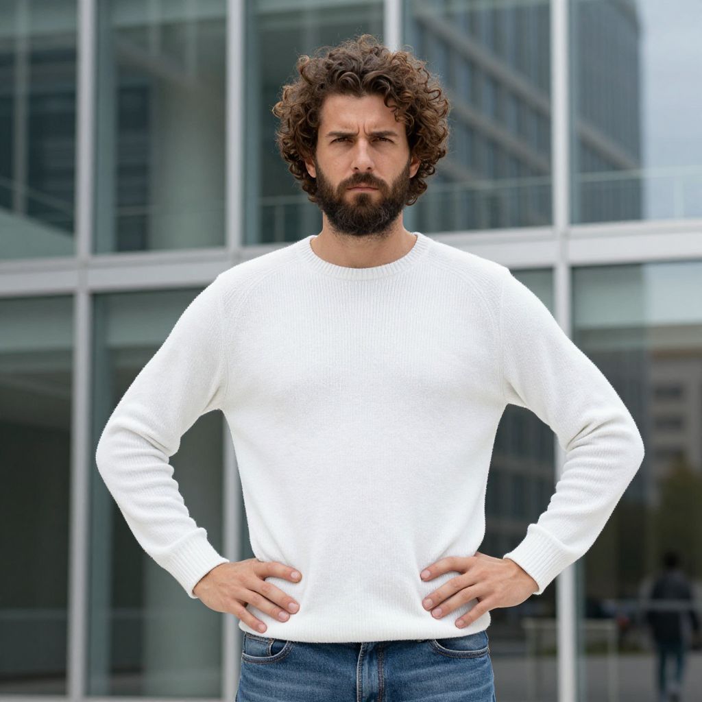 A man with curly hair and a beard stands outdoors in front of a modern glass building. He is wearing a white knitted sweater and blue jeans, posing confidently with his hands on his hips, showcasing a casual yet assertive demeanor.