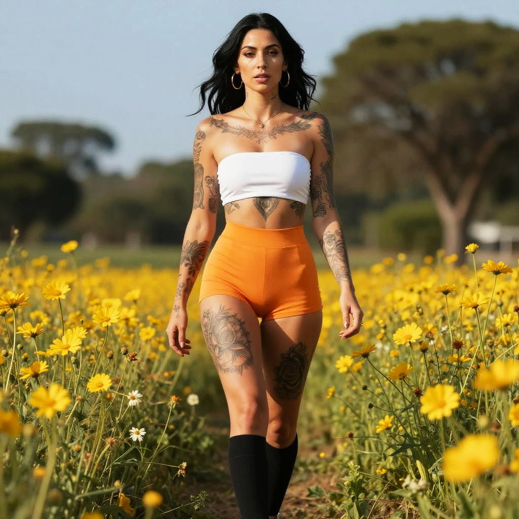 A confident tattooed woman walks through a vibrant field of yellow flowers wearing a white tube top, bright orange high-waisted shorts, and black knee-high socks. The natural outdoor setting combined with her bold style creates a striking contrast that highlights both her tattoos and the lively floral backdrop.