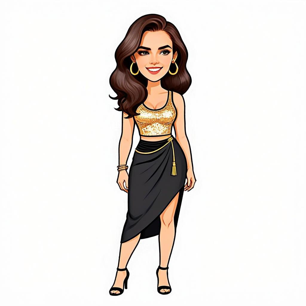 This is a stylized digital illustration of a confident woman with a pretty face and flowing brunette hair. She is dressed in a glamorous evening wear outfit, featuring a shimmering gold crop top and a black high-slit skirt, accessorized with hoop earrings and bracelets, embodying a chic and fashionable evening look.