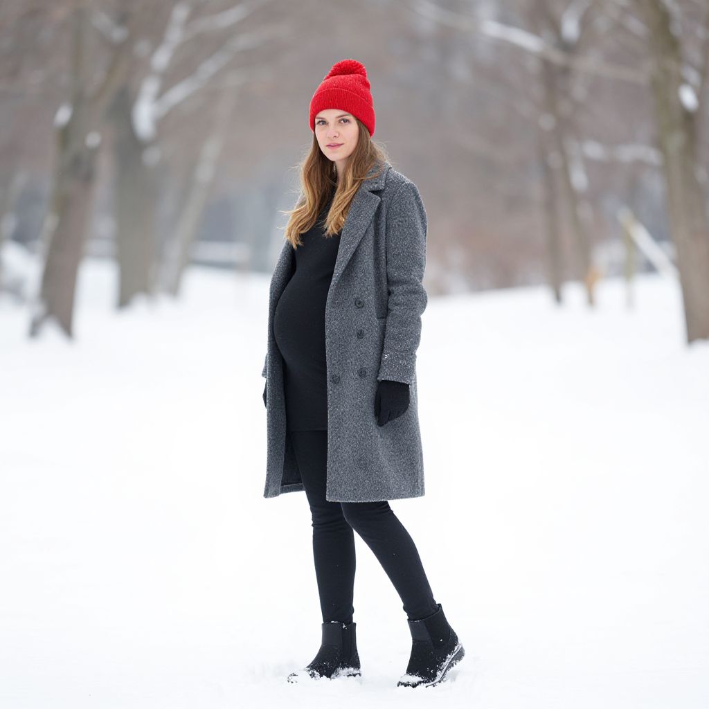 A pregnant woman stands confidently in a snowy winter landscape, dressed warmly in a grey wool coat, black outfit, and a bright red knit hat. The soft-focus background of bare trees contrasts with the sharp details of her winter attire, highlighting both the season and her serene expression.