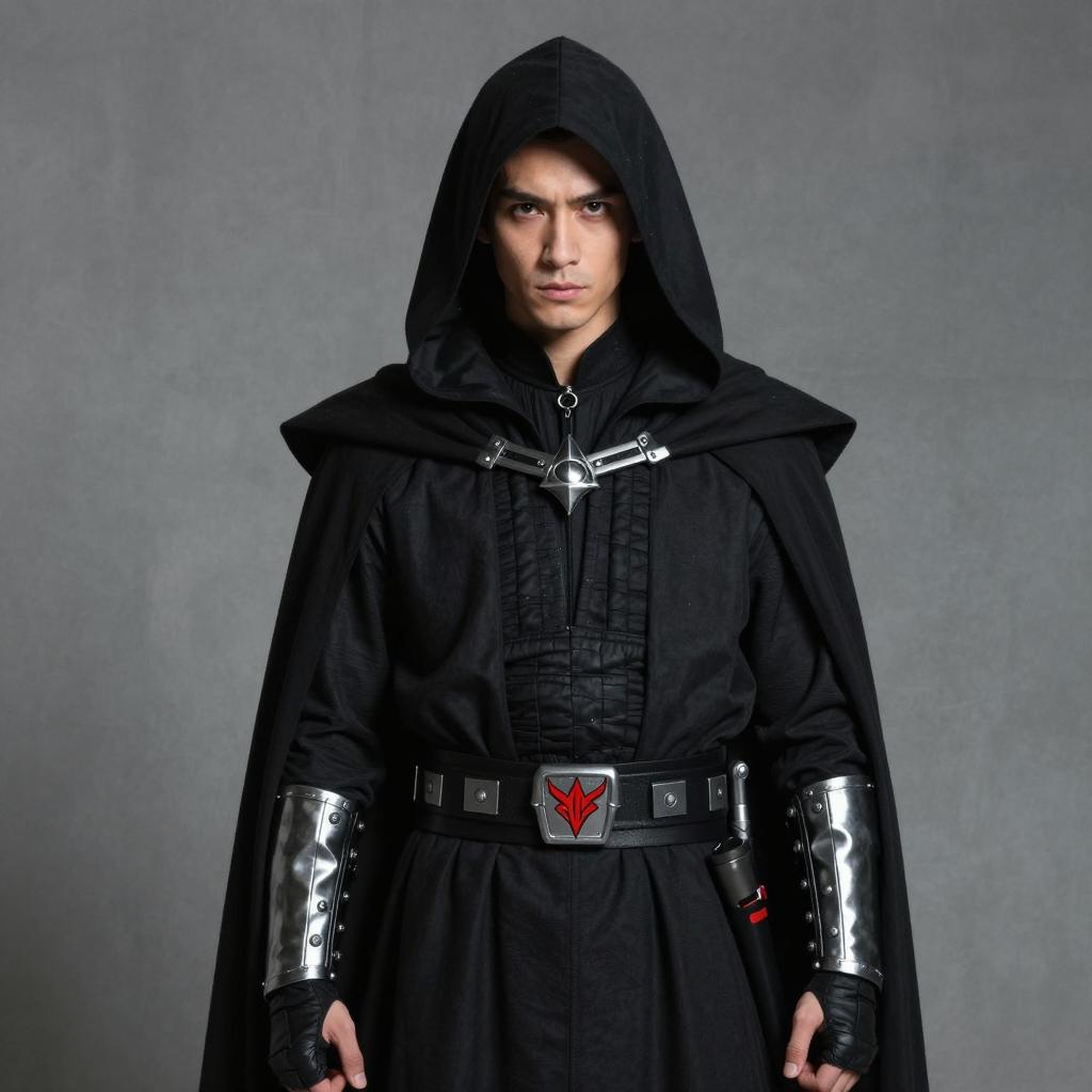 A man dressed in a detailed black cloak and hood, evoking a dark, sci-fi fantasy theme, stands with a stern expression. His outfit includes metallic arm guards and a distinctive belt with a red emblem, suggesting a character inspired by futuristic or galactic warrior aesthetics.