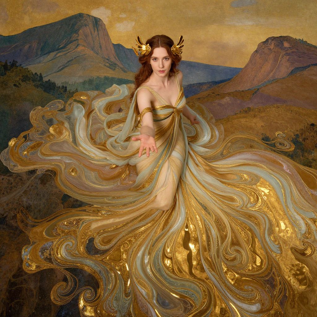 A woman dressed in an elegant, flowing gown with golden and cream hues stands gracefully against a painterly mountainous backdrop. Her dress blends seamlessly with the ethereal, swirling patterns, evoking an Art Nouveau aesthetic with a touch of fantasy. The image captures a mystical and serene atmosphere, highlighting the woman's poised and inviting gesture.
