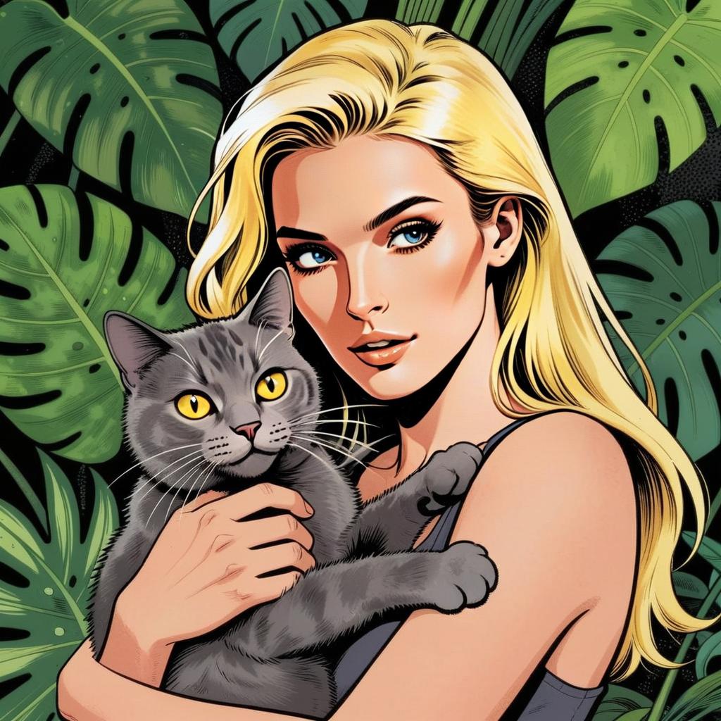 Blonde Woman Holding Gray Cat in Comic Book Style with Tropical Leaves Background