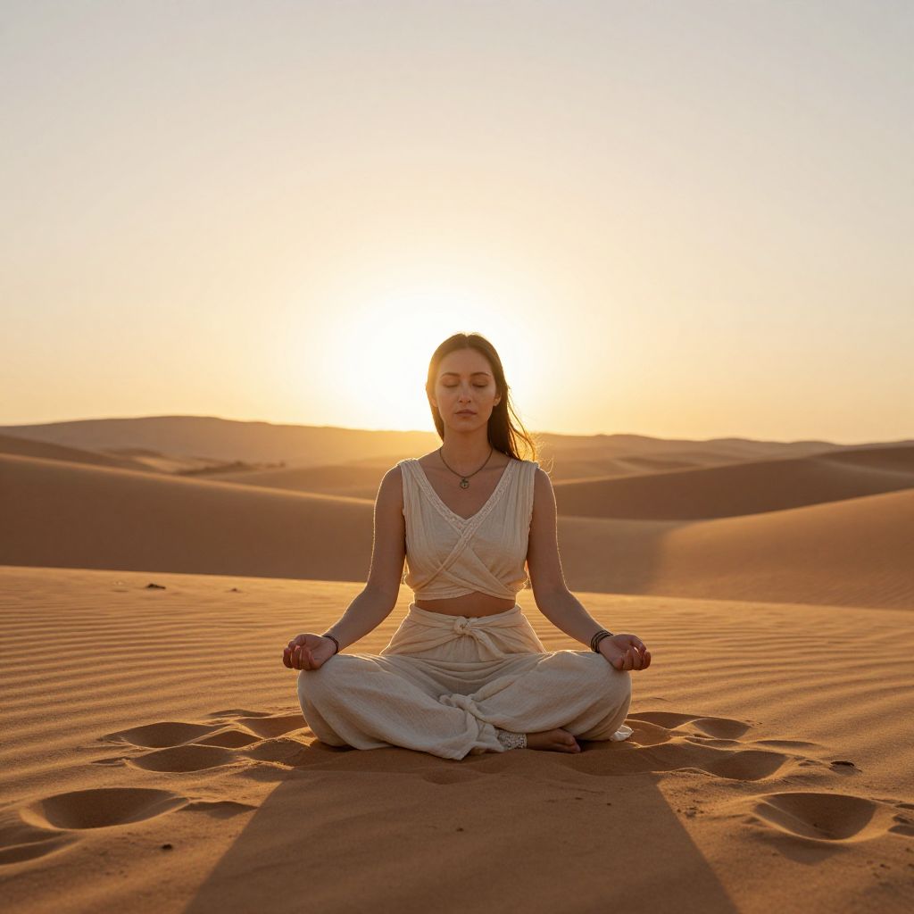 A woman dressed in light, flowing clothing sits cross-legged on the desert sand, meditating peacefully with her eyes closed as the sun sets behind her. The serene atmosphere is enhanced by the vast, undulating sand dunes stretching into the horizon under a clear sky.