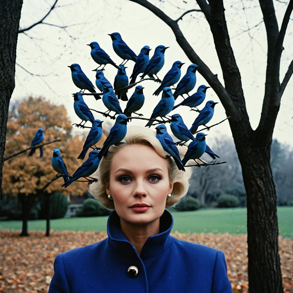 A striking portrait inspired by the iconic Hitchcock film 'The Birds,' featuring a woman with elegantly styled blonde hair, standing outdoors amid autumn foliage. She wears a cobalt blue coat, and multiple vivid blue birds perched dramatically on her head and branches around her, creating a surreal and eerie atmosphere reminiscent of classic 1960s suspense horror.