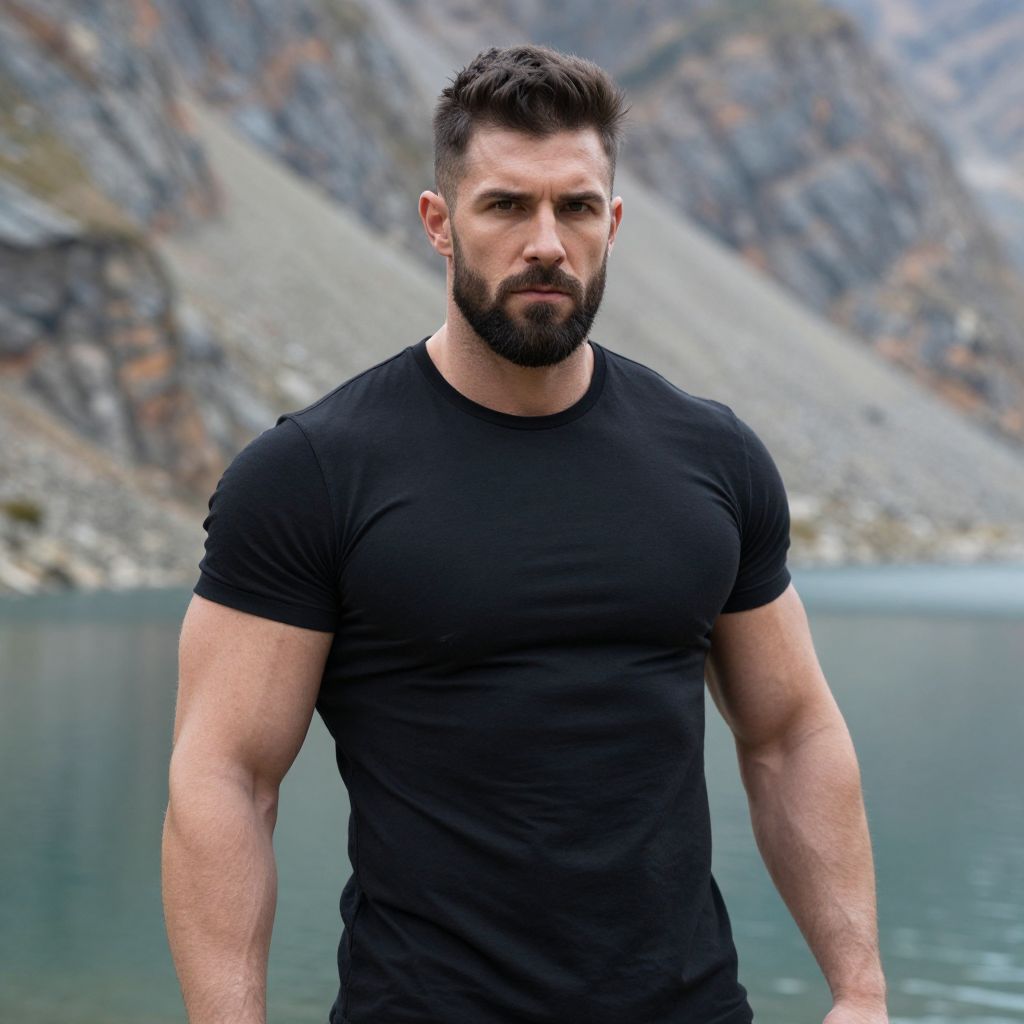 A muscular man with a beard and styled hair is standing outdoors near a serene mountain lake. He wears a fitted black t-shirt that highlights his physique against the rocky and natural backdrop. The image captures a rugged, natural style emphasizing strength and outdoor adventure.