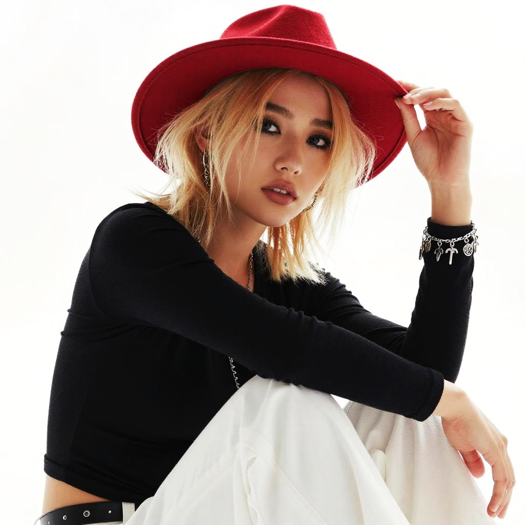A stylish woman with blonde hair wears a vibrant red wide-brim hat paired with a black long-sleeve top and white pants, creating a striking contrast. She poses confidently against a clean white background, showcasing contemporary fashion and accessorized with silver charm bracelets and hoop earrings.
