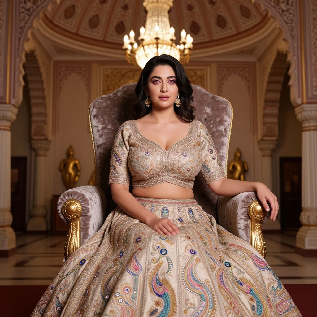 A woman elegantly dressed in a richly embroidered traditional Indian outfit sits gracefully on a luxurious velvet chair with golden accents, set in an ornate palace interior featuring intricate arches and a grand chandelier. The detailed patterns and pastel hues on her lehenga blend beautifully with the warm, regal ambiance of the setting.