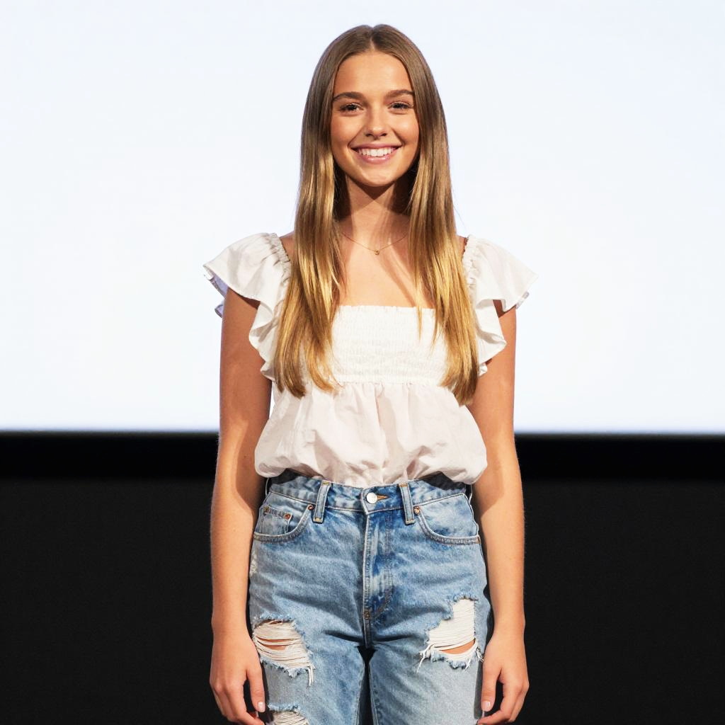 A young woman stands confidently wearing a white ruffled off-shoulder top paired with distressed light blue jeans. She smiles warmly against a simple backdrop, highlighting her casual and trendy style.