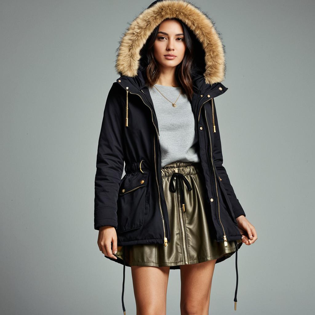 The woman is wearing a casual black parka jacket featuring gold-tone hardware and adjustable drawstrings, paired with a grey top and a metallic olive green skirt. The jacket’s fur-lined hood adds a stylish and cozy touch, perfect for chic winter fashion.