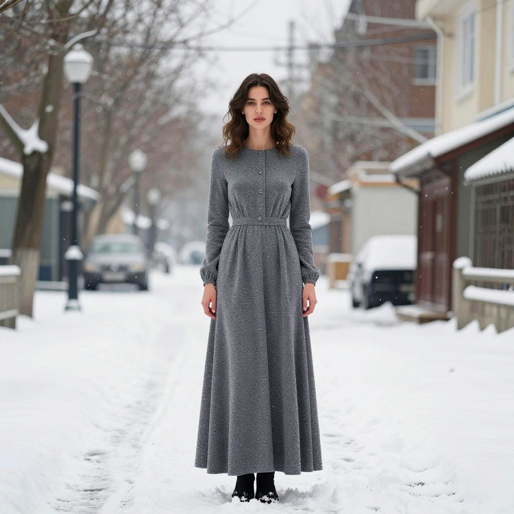 A woman stands gracefully in the middle of a snow-covered street, wearing a long, elegant grey winter dress with full sleeves and a buttoned front. The dress has a classic, modest style, perfect for a winter occasion, blending simplicity with sophistication against the serene winter backdrop.
