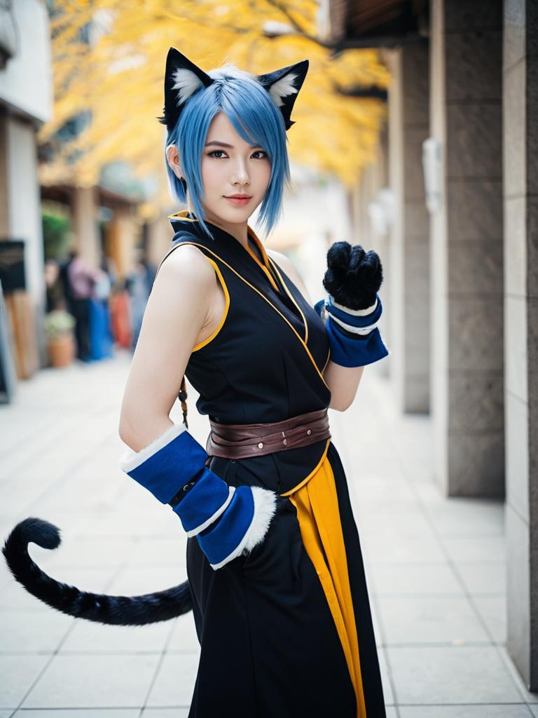 A woman dressed as a cat-inspired character from the Monk class in Final Fantasy, featuring blue hair, black cat ears, and a matching tail. Her cosplay outfit is a black and yellow robe with blue and white fur-trimmed gloves, embodying a vivid and realistic anime style captured outdoors with soft natural lighting.