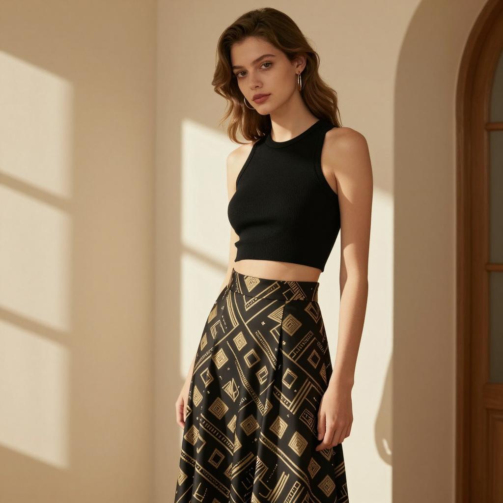 A stylish young woman models a modern Gen Z-inspired outfit featuring a sleek black crop top paired with a high-waisted skirt adorned with an intricate geometric pattern. The warm natural lighting and minimalistic interior highlight the contemporary and chic fashion look.
