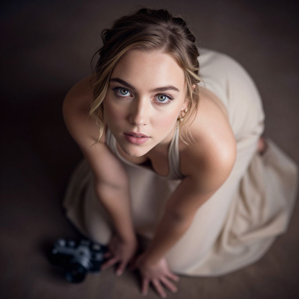 Portrait of Woman with Blue Eyes in Beige Dress Holding Camera