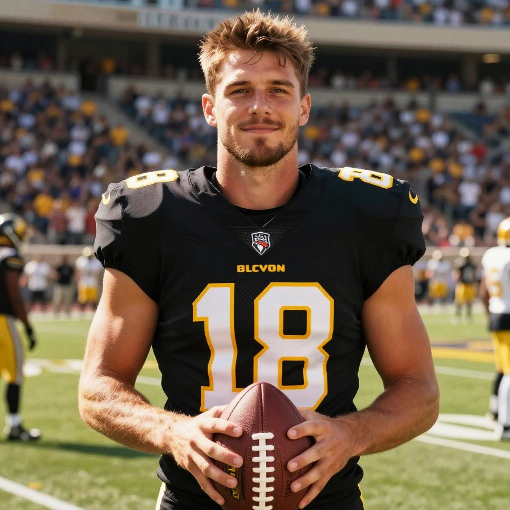 A confident young man wearing a black football jersey with the number 18 stands on a sunny stadium field, holding a football in his hands. The background features blurred teammates and an audience in the stands, highlighting a lively sports event atmosphere.