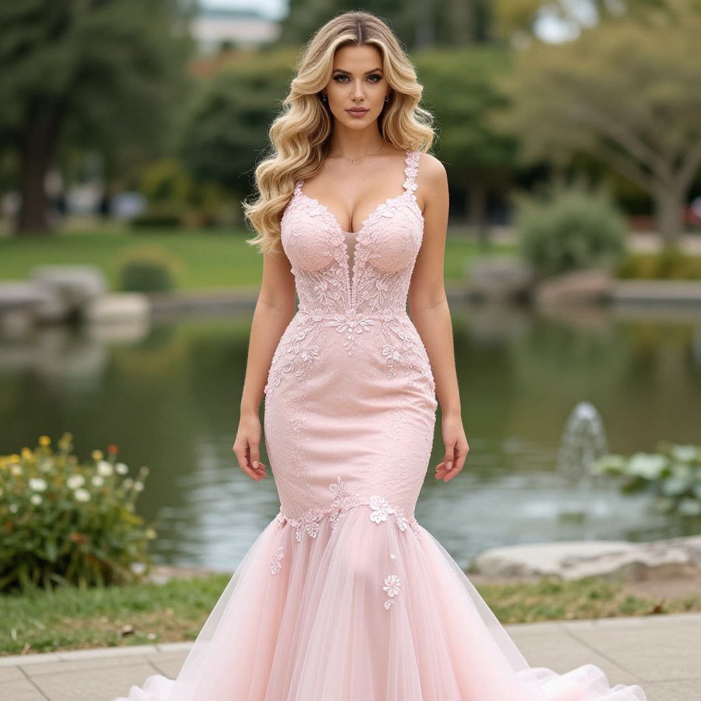 A glamorous woman stands outdoors near a pond, wearing a stunning blush pink mermaid-style gown adorned with delicate floral lace appliqués. Her long, wavy blonde hair and elegant makeup complement the sophisticated and romantic vibe of this formal dress fashion portrait.