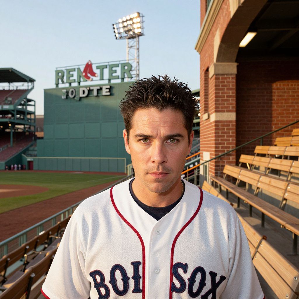 A focused man wearing a Boston Red Sox baseball jersey stands in the empty dugout area of Fenway Park, the iconic baseball stadium. The image captures the iconic Green Monster scoreboard in the background and the warm evening light on the player’s face.