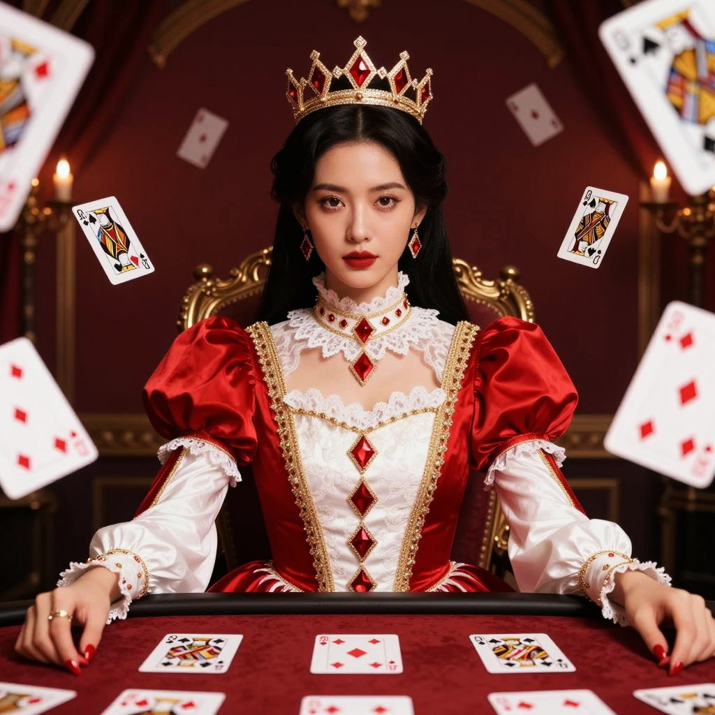 A regal woman dressed in an elaborate red and white Renaissance-style gown with gold and jewel embellishments sits confidently at a card table, surrounded by floating playing cards. She wears a matching crown and jewelry, exuding a powerful and majestic aura in a richly decorated, dark-toned room.