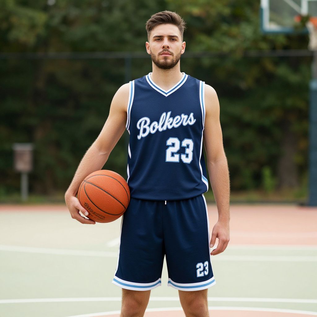 A focused young man stands on an outdoor basketball court wearing a navy blue basketball uniform with the team name 'Bolkers' and number 23. He holds a basketball confidently in his right hand, set against a blurred background of trees and sports equipment, capturing a sporty and determined vibe.