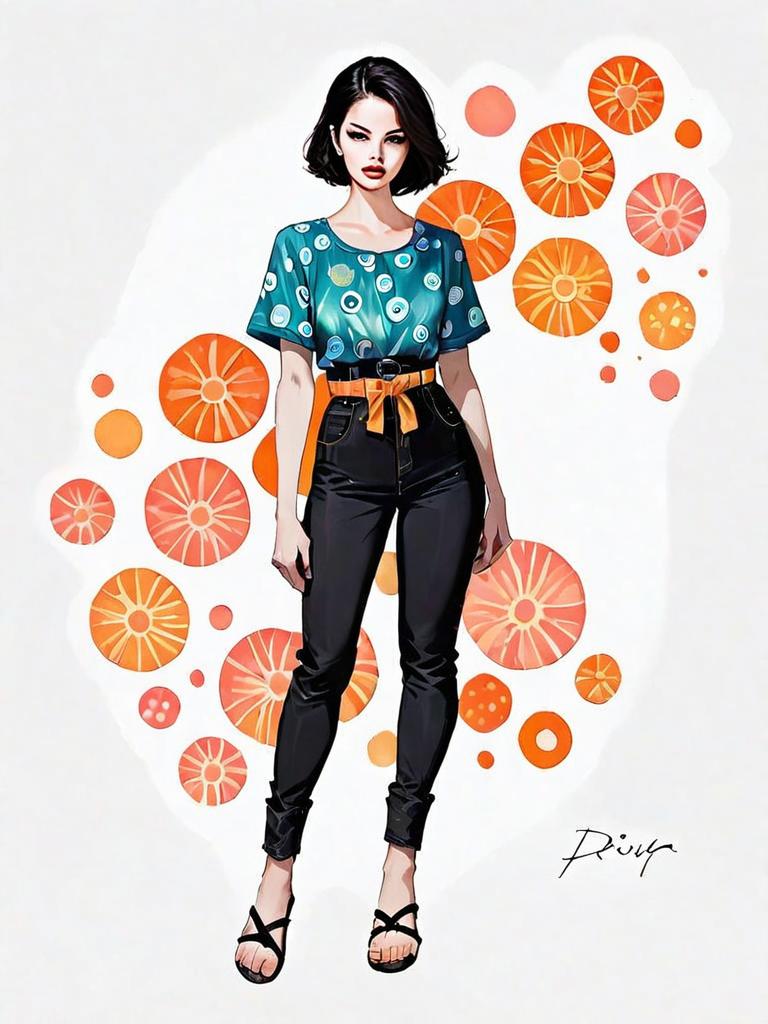 This digital illustration features a confident woman in a bohemian-inspired outfit, standing in a full-body pose. She wears a patterned teal blouse paired with high-waisted black pants and sandals, set against a whimsical backdrop of orange circular shapes, blending comic book style with realistic facial details. The artwork combines modern fashion illustration with vibrant colors and stylish composition.