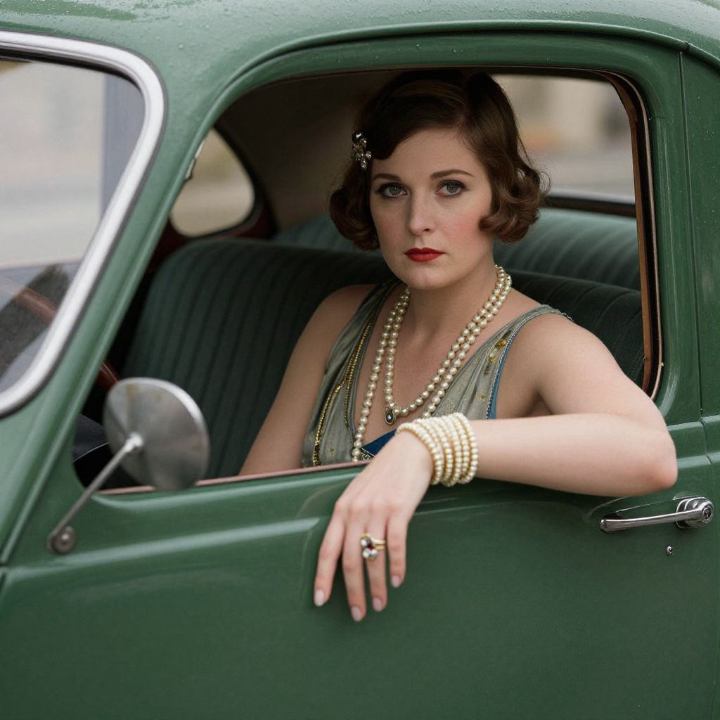 A woman dressed in 1920s vintage fashion sits poised in the driver's seat of a classic green car, her expression calm and contemplative. She wears pearl jewelry and a hair clip that perfectly complement her elegant flapper-style dress, capturing the essence of the Roaring Twenties.