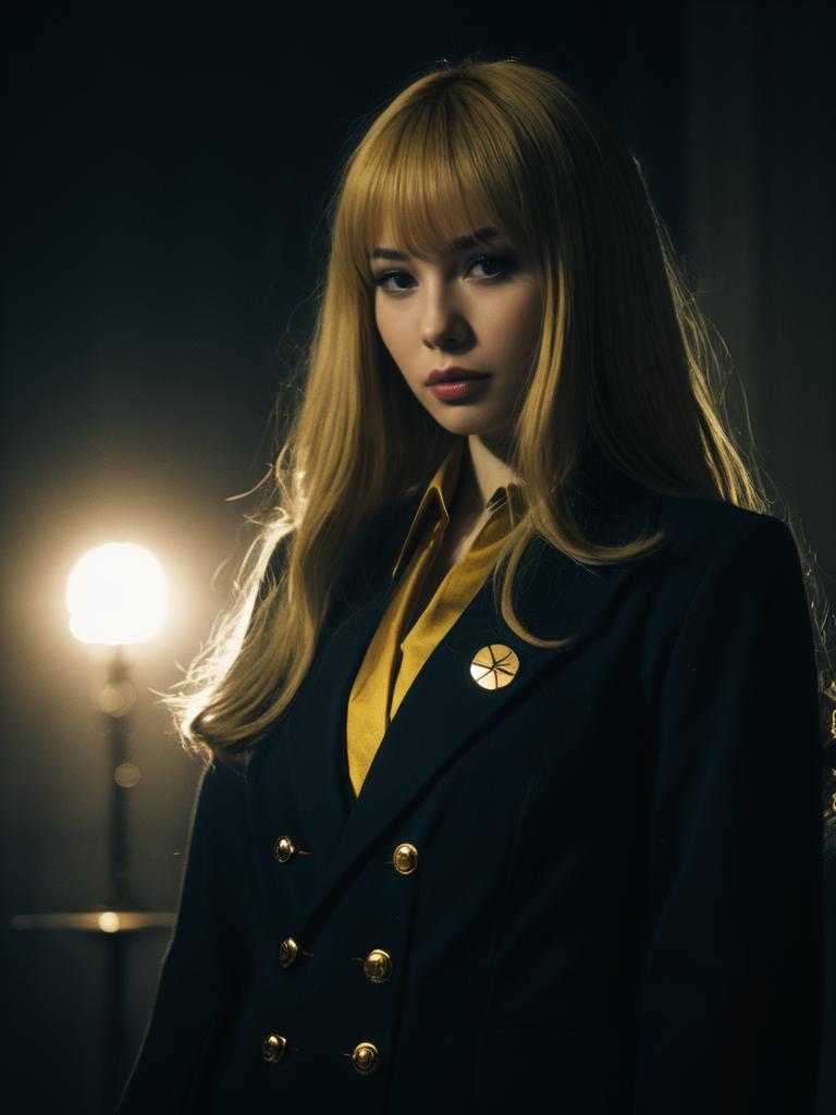 The image features a woman dressed as Kinako Sakurakouji, showcasing a stylish cosplay with a dark, double-breasted coat adorned with gold buttons and a matching yellow shirt underneath. The lighting creates a dramatic and moody atmosphere, emphasizing the realistic and detailed nature of the costume and her blonde hair.