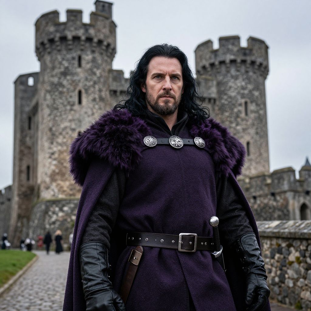 A man dressed in medieval attire stands confidently in front of an ancient stone castle with cylindrical towers. He wears a dark purple cloak with fur trims, leather gloves, and a belt holding a sheathed sword, embodying the essence of a noble warrior from a historical or fantasy setting.