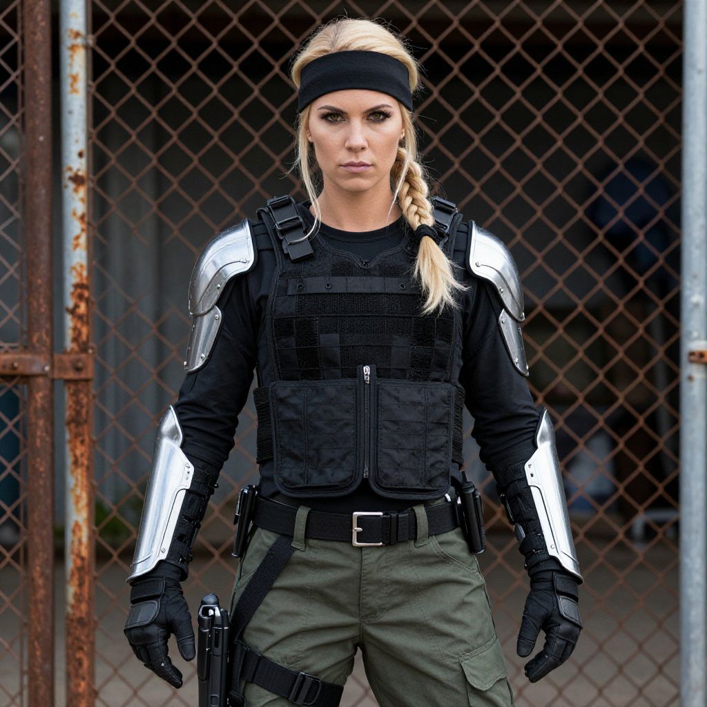 A determined woman dressed in tactical gear stands in front of a rusted metal fence, showcasing a combination of modern black combat attire and shiny silver armor pieces on her shoulders and forearms. Her blonde hair is styled in a braid with a black headband, highlighting her focused and intense expression against an industrial background.
