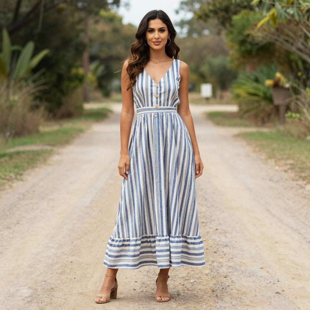 A woman stands confidently on a dirt path, wearing a sleeveless Woodstock-style dress featuring vertical blue and white stripes and a button-down front. The dress has a flattering V-neckline and a ruffled hem, capturing a rustic yet chic summer vibe.