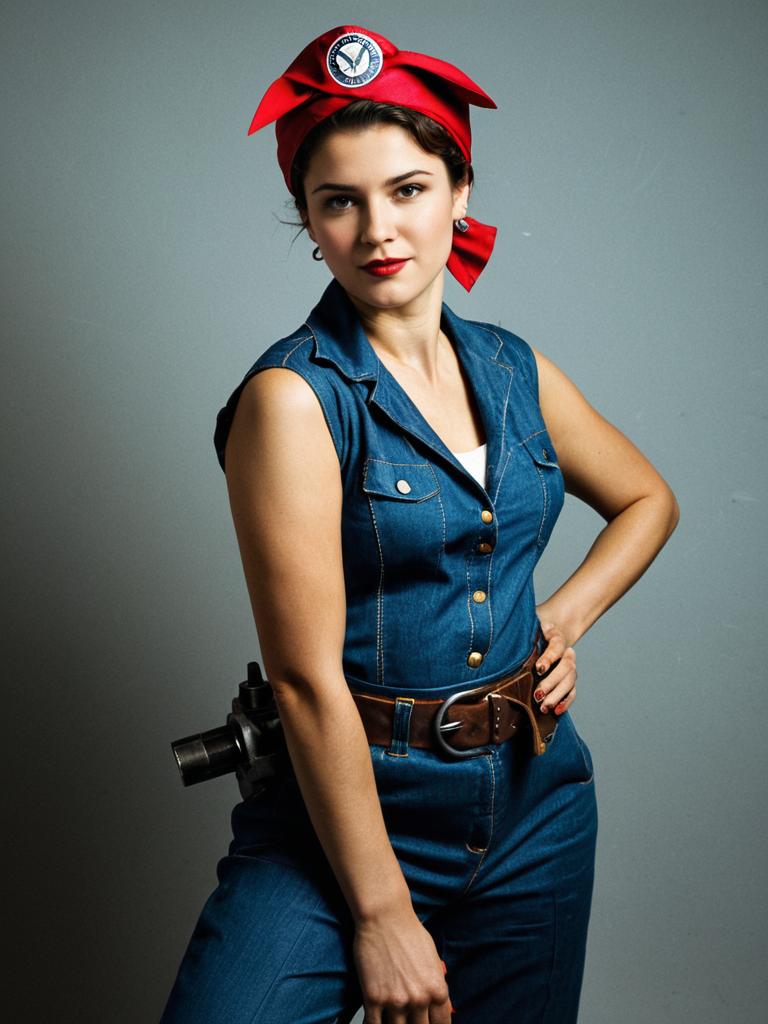 A confident woman dressed in a classic Rosie the Riveter costume, featuring a denim jumpsuit and a bright red headscarf with an emblem. This photorealistic cosplay pays homage to the iconic WWII era symbol of female empowerment and strength.